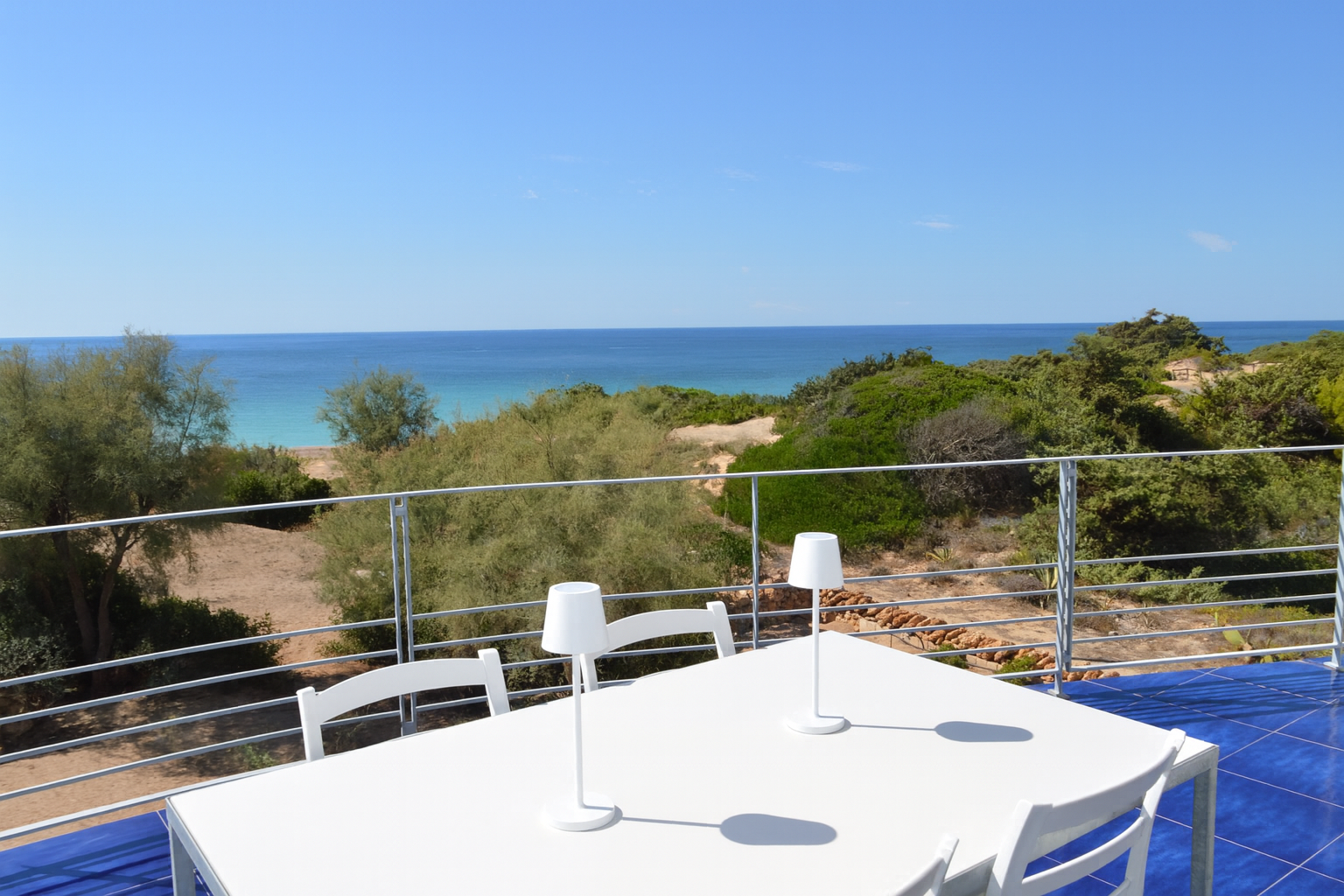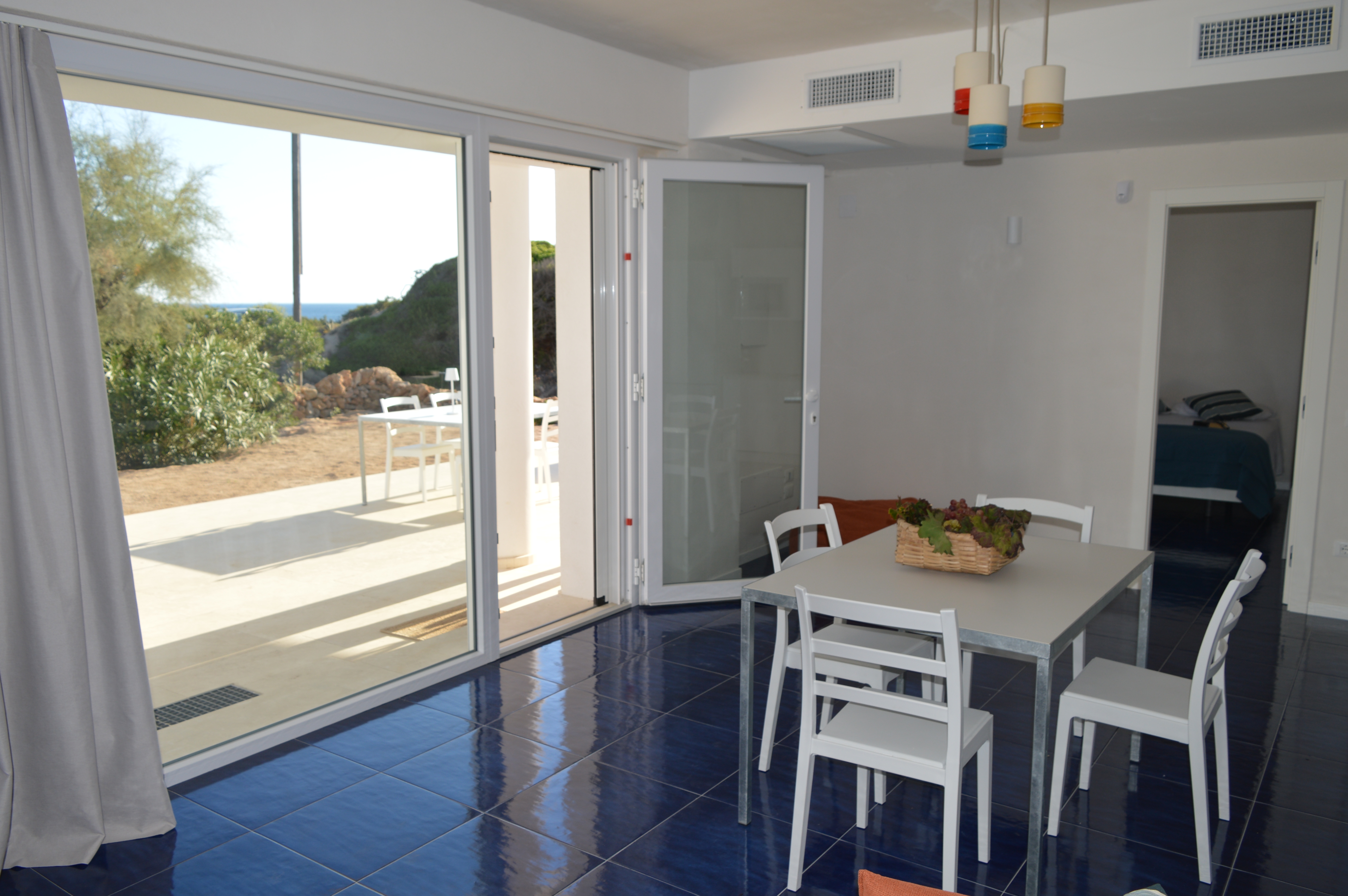 Il pavimento artigianale color blu mare attraversa ogni ambiente con la sua tonalità intensa e vibrante. Camminarci sopra è come seguire il movimento dell’acqua, un invito a lasciarsi andare, a rallentare, a respirare.